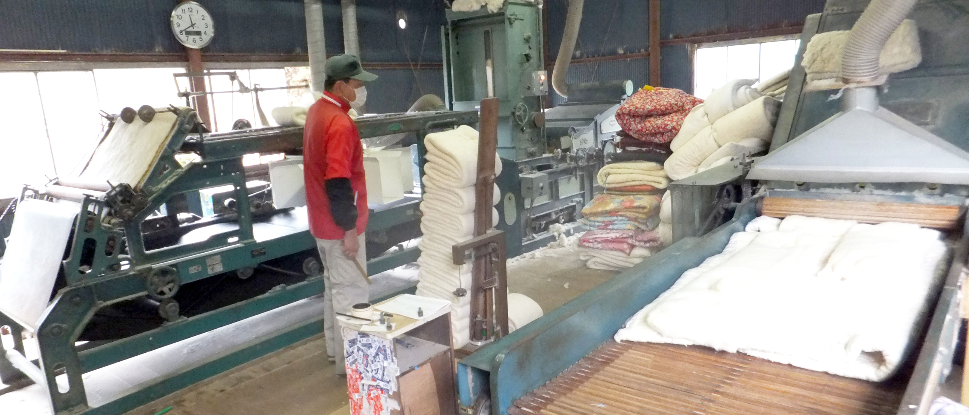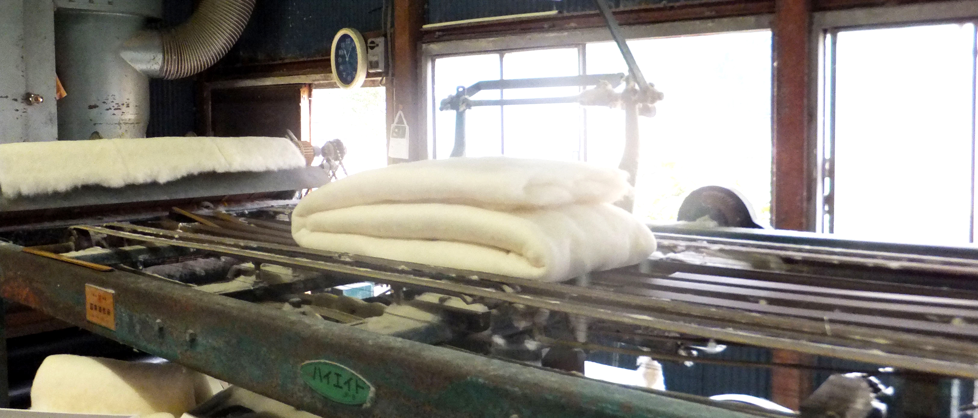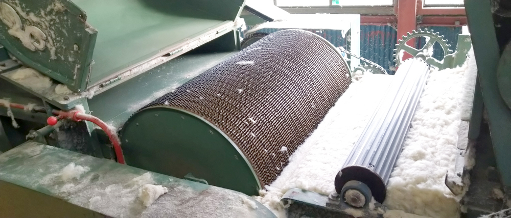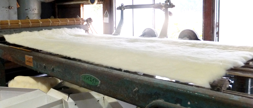 細かくなった綿を製綿機にかけ、さらに細かくしてふわふわの状態に戻していきます。