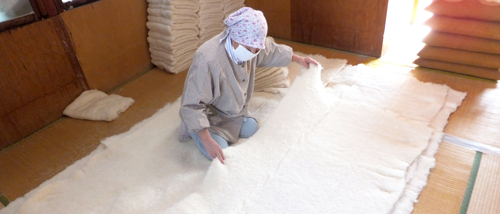 熟練の職人が正確に綿を並べていきます。